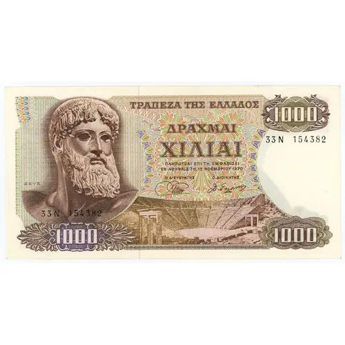 | Obverse lettering | ΤΡΑΠΕΖΑ ΤΗΣ ΕΛΛΑΔΟΣ 1000 ΔΡΑΧΜΑΙ ΧΙΛΙΑΙ ΠΛΗΡΩΤΕΑΙ ΕΠΙ ΤΗ. ΕΜΦΑΝΙΣΕΙ ΕΝ ΑΘΗΝΑΙΣ ΤΗ. 1η ΝΟΕΜΒΡΙΟΥ 1970 Ο ΔΙΕΥΘΥΝΤΗΣ Ο ΔΙΟΙΚΤΗΤΣ ΖΕΥΣ 1000 1000 Λ Ο (Translation: Bank of Greece 1000 One Thousand Drachmai Payable on appearance In Athens, 1st of November 1970 The manager (signature unknown) The governor (signature of Dimitrios Galanis) Zeus 1000 1000 L O) |