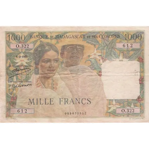 | Opis líce | 1000 BANQUE DE MADAGASCAR ET DES COMORES 1000 LE CONTROLEUR GÉNÉRAL, LE DIRECTEUR GÉNÉRAL, MILLE FRANCS W. FEL FEC. G. BELTRAND SC. (Translation: 1000 BANK OF MADAGASCAR AND THE COMOROS 1000 CONTROLLER GENERAL, (signature) MANAGING DIRECTOR, (signature) THOUSAND FRANCS) |