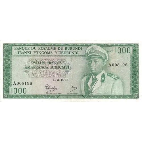 | Legenda del dritto | BANQUE DU ROYAUME DU BURUNDI IBANKI Y`INGOMA Y`UBURUNDI MILLE FRANCS AMAFRANGA IGIHUMBI 1.2.1965 LE VICE-PRESIDENT LE PRESIDENT 1000 (Translation: Bank of the Kingdom of Burundi. One thousand francs. The vice president, the president.) |