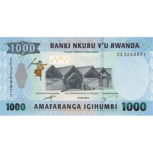Legenda do reverso NATIONAL BANK OF RWANDA THIS NOTE IS LEGAL TENDER ONE THOUSAND FRANCS