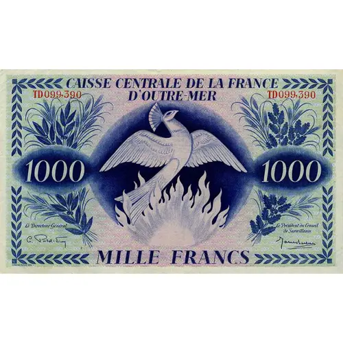 | Légende du revers | CAISSE CENTRALE DE LA FRANCE LIBRE L`ART. 139 DU CODE PENAL PUNIT DES TRAVAUX FORCÉS CEUX QUI AURONT CONTREFAIT OU FALSIFIÉ LES BILLETES DE BANQUE AUTORISÉS PAR LA LOI AINST CEUX QUI AURONT FAIT USSAGE DE CES BILLETES CONTRAFAITS OU FALSIFIÉS ORDONANCE DU 2 DEC 1941 (Translation: Central Fund of Free France Article 139 of the Penal Code punishes with forced labor those who have counterfeited or falsified bank notes authorized by law as well as those who have used these counterfeit or falsified banknotes. 1000 Law of December 2, 1941.) |