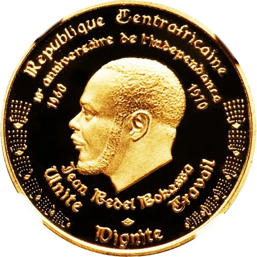 | Leyenda del anverso | Republique Centrafricain 10ᵉ anniversaire de l`independance 1960 1970 Jean Bedel Bokassa Unite Travail Dignite (Translation: Central African Republic 10th anniversary of independence 1960 1970 Jean Bedel Bokassa Unity Dignity Work) |