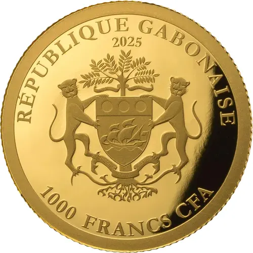RÉPUBLIQUE GABONAISE 2025 UNITI PROGREDIEMUR UNION TRAVAIL JUSTICE 1000 FRANCS CFA (Translation: We shall go forward united Unity Work Justice) |