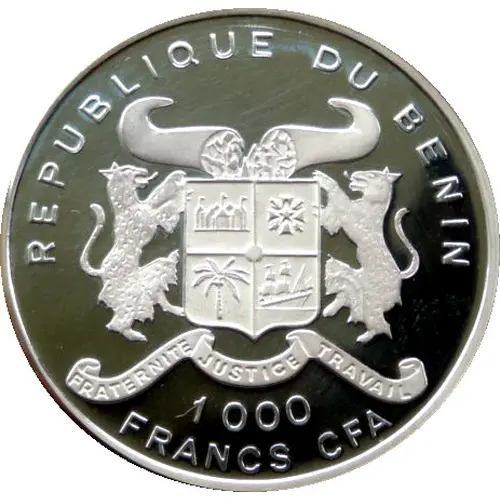 | 表面の銘文 | REPUBLIQUE DU BENIN FRATERNITE JUSTICE TRAVAIL 1000 FRANCS CFA |