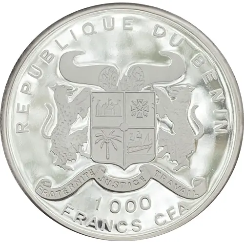 | Obverse lettering | REPUBLIQUE DU BENIN FRATERNITE JUSTICE TRAVAIL 1000 FRANCS CFA |