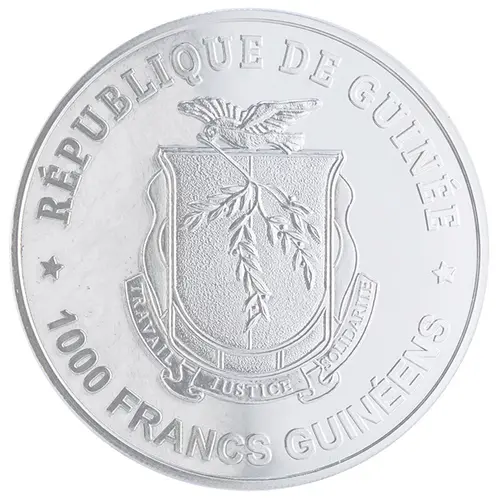| نوشتههای روی سکه | * RÉPUBLIQUE DE GUINÉE * 1000 FRANCS GUINÉENS (Translation: Republic of Guinea 1000 Guinean Francs) |