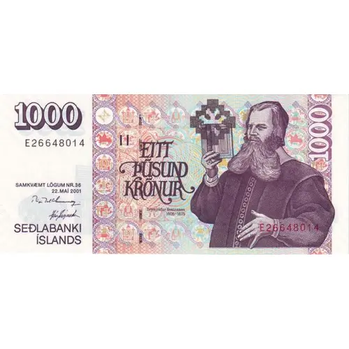 SAMKVÆT LÖGUM NR.36 22. MAI 2001 SEÐLABANKI ÍSLANDS EITT ÞÚSUND KRÓNUR (Translation: IN ACCORDANCE WITH LAW NO.36 22nd MAY 2001 CENTRALBANK OF ICELAND ONE THOUSAND KRONAS (CROWNS)) |
