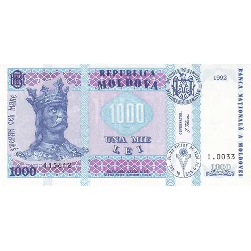 REPUBLICA MOLDOVA STEFAN CEL MARE 1000 UNA MIE LEI GUVERNATOR 1000 FALSIFICAREA ACESTOR BILETE SE PEDEPSESTE CONFORM LEGILOR PE-UN PICIOR DE PLAI, PE-O GURA DE RAI... 1000 1992 BANCA NATIONALA A MOLDOVEI |