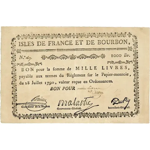 | Надписи лицевой стороны | ISLES DE FRANCE ET DE BOURBON BON POUR LA FOMME DE MILLE LIVRES, PAYABLE AUX TERMES DU REGLEMENT FUR LE PAPIER-MONNOIE, DU 28 JUILLET 1790, VALEUR RECUE EN ORDONANCES. |