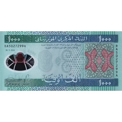 | Obverse lettering | البنك المركزي الموريتاني ألف أوقية ١٠٠٠ (Translation: Central Bank of Mauritania, 1000 One Thousand Ouguiya) |