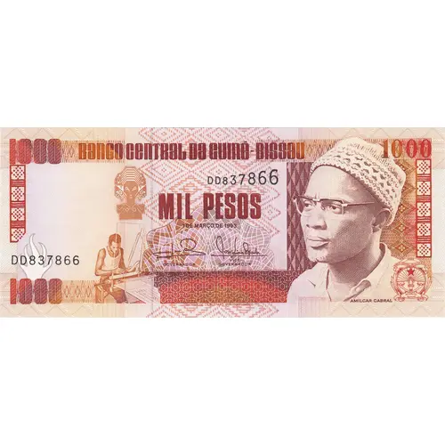 | 正面铭文 | BANCO CENTRAL DA GUINÉ-BISSAU MIL PESOS 1 DE MARÇO DE 1993 Luis Candido Ribeiro (governador) & Jose Lima Barber (vice-governador) (Translation: Central Bank of Guinea-Bissau Thousand Pesos March 1st., 1993) |