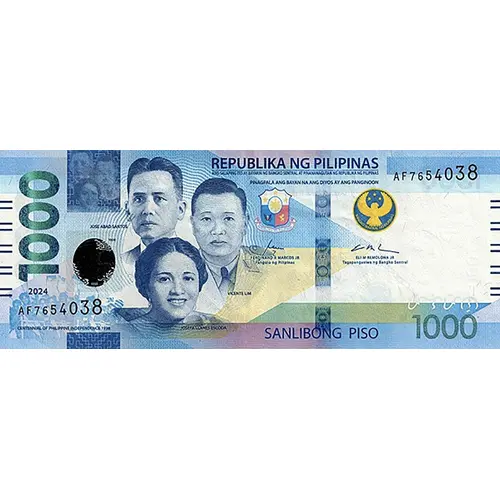 | Описание лицевой стороны | Dark navy blue print on sky blue, pink, yellow, and light green underprint; serial numbers black. Tactile marks at right. Busts of José Abad Santos, Vicente Lim and Josefa Llanes Escoda, all front-facing at left centre, scene of the Centennial Celebration of Philippine Independence at lower left. Hologram patch to the left of the bust, coat of arms of the Philippines and the Central Bank to the right of the bust. Windowed security thread in between both coats of arms. At bottom-right, small denomination 1000 printed in colour-shifting ink. |