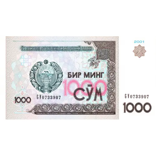 | Leyenda del anverso | ЎЗБЕКИСТОН РЕСПУБЛИКАСИ МАРКАЗИЙ БАНКИ БИР МИНГ 1000 СЎМ ЎЗБЕКИСТОН СЎМИ РЕСПУБЛИКА ҲУДУДИДА ХАММА ТЎЛОВАР УЧУН ЎЗ ҚИЙМАТИ БЎЙИЧА ҚАБУЛ ҚИЛИНИШИ ШАРТ (Translation: Central Bank of the Republic of Uzbekistan, One Thousand So‘m, The Uzbek so‘m must be accepted at face value for all payments in the republic) |