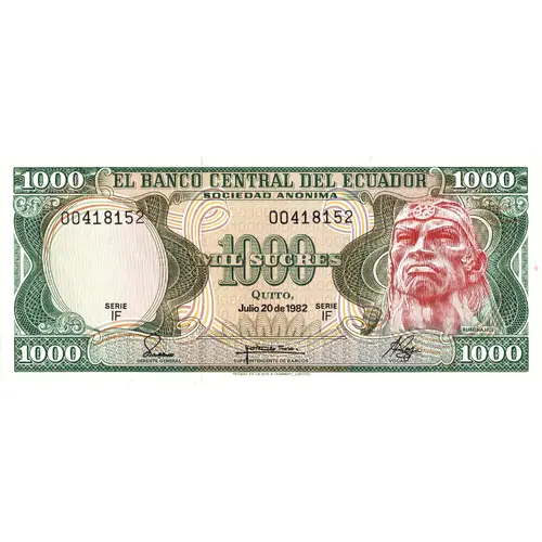| Obverse lettering | EL BANCO CENTRAL DEL ECUADOR SOCIEDAD ANONIMA 1000 MIL SUCRES QUITO, Junio 20 de 1982 RUMIÑAHUI (Translation: The Central Bank of Ecuador, Anonymous society 1000 One thousand Sucres Quito, July 20th., 1982 Rumiñahui) |