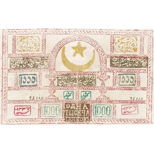 | Opis líce | ۱000 ۱۳۳۷ 1000 ОДНА ТЫСЯЧА ТЕНЬГОВЪ (Translation: 1000, 1337, One Thousand Tengov) |