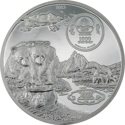 The coin`s obverse side depicts two young brown bear playing with a puddle. In the background, a mother with two cubs, a water stream, and mountains. The obverse also incorporates the Coat of Arms of Mongolia and the inscriptions: `MONGOLIA` – the country of issue, `2023` – the year of issue, `1000 Togrog` – the face value and `2 oz .999 SILVER` – the weight of the coin and the fineness of the Silver. |