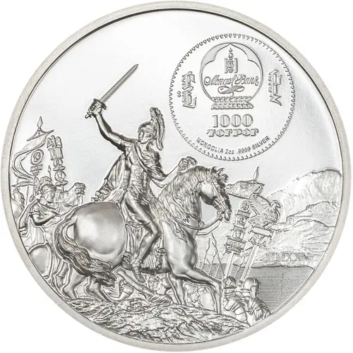 | Надписи аверса | MongolBank ᠮᠤᠩᠭᠤᠯ ᠤᠯᠤᠰ 1000 TӨГРӨГ MONGOLIA 2 oz .9999 SILVER MMXXV (Translation: MongolBank Monggol Ulus 1000 Tögrög 2025) |