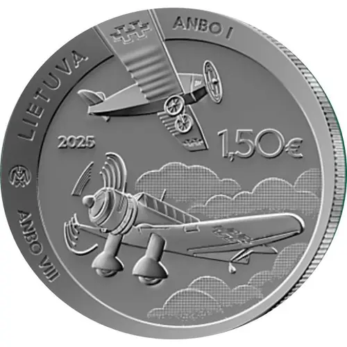| Obverse description | The obverse of the coin features stylised models of ANBO aircraft and the double cross. In a semicircle are titles of aircraft “ANBO I” and “ANBO VIII”, the inscription “Lithuania” (Lietuva) and the mintmark of the Lithuanian Mint. The denomination (€1.50) and the year of issue (2025) appear next to the models |