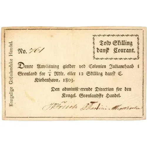 | Légende de l’avers | Kongelige Grönlandske Handel Tolv Skilling danſk Courant Denne Anviisning gielder ved Colonien Julianehaab i Grønland for 1/8 Rdlr. eller 12 Skilling danſk C. Kiøbenhavn, 1803. Den adminiſtrerende Direction for den Kongl. Grønlandſke handel (Translation: Royal Greenlandic Trading 12 Skilling Danish Courant This note is valid at the Colony of Julianehaab in Greenland for 1/8 of a Rigsdaler or 12 Skilling Courant. Copenhagen, 1803 The administrating direction for the Royal Greenlandic Trading) |