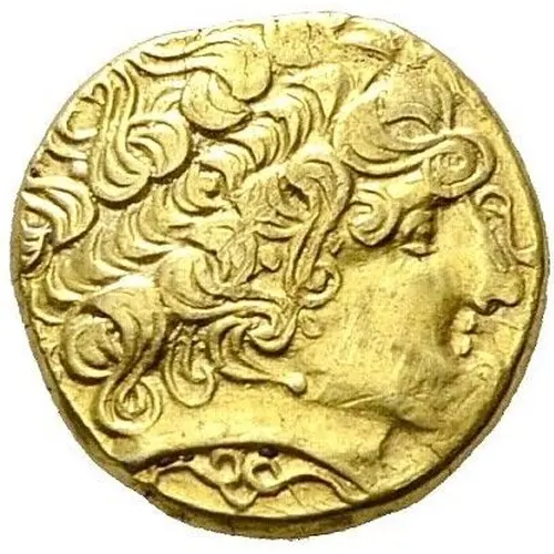 | Aversbeschreibung | Celticized laureate head of Apollo to right, the hair devolved into long curls with a strand falling loose before the forehead. |