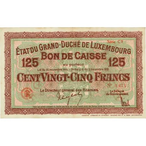 | Legenda awersu | ÉTAT DU GRAND-DUCHÉ DE LUXEMBOURG BON DE CAISSE 125 au porteur Loi du 28 novembre 1914 - Arrêté g.-d. du 11 décembre 1918 CENTVINGT-CINQ FRANCS Le Directeur général des Finances Ceux qui auront contrefait ou falsifié des Bons de caisse seront punis des travaux forcés de 15 à 20 ans. (Translation: State of the Grand Duchy of Luxembourg Cash Voucher to bearer Law of November 28, 1914 - General Decree from December 11, 1918 One Hundred and Twenty-Five Francs The Director-General of Finances Those who have counterfeited or falsified Cash Vouchers will be punished with forced labor for 15 to 20 years.) |