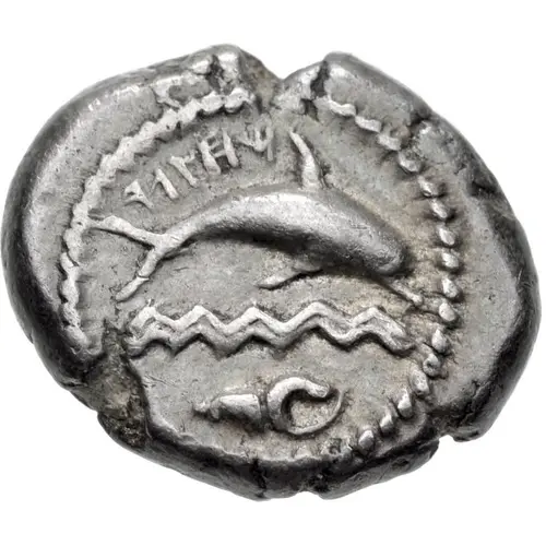 | توضیحات روی سکه | Dolphin right; ŠLŠN (in Phoenician) above, waves and murex shell below. |