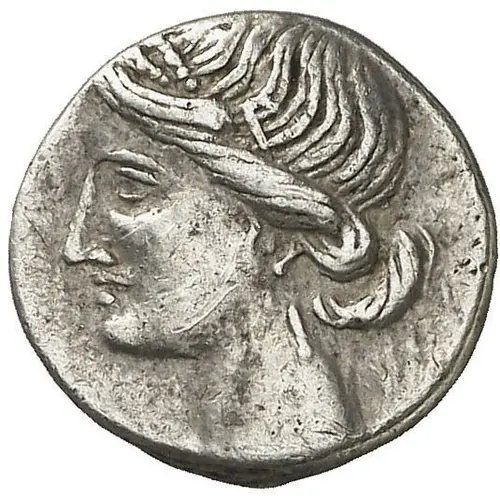 | Obverse description | Head of Tanit left, wreathed with corn, wearing necklace and single-drop ear-ring. |