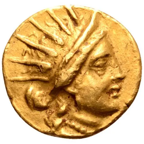 | Mô tả mặt trước | Head of Helios right, wearing radiate stephanos, single-pendant earring, and pearl necklace. |