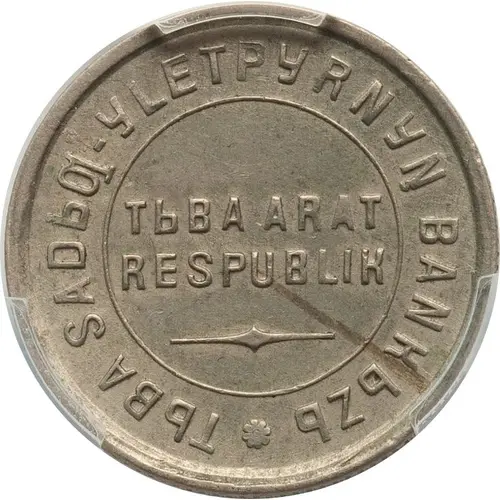 | Obverse lettering | TЬBA SADЬƢ-YLETPYRNYꞐ BANKЬZЬ • TЬBA ARAT RESPUBLIK (Translation: Tuvan Commercial Industrial Bank, People`s Republic of Tuva) |