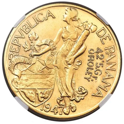 | Opschrift voorzijde | REPVBLICA DE PANAMA 42`5.Gr. ORO LEY PRO MUNDI BENEFICIO 1947 (Translation: Republic of Panama 42.5 Grams Fine Gold For the Benefit of the World) |