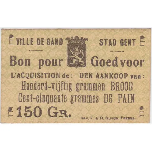 | 正面铭文 | E surmonté d`un point aux quatre coins VILLE DE GAND - STAD GENT Bon pour Goed voor L`ACQUISITION de : DEN AANKOOP van : Honderd-vijftig grammen BROOD Cent-cinquante grammes DE PAIN 150 Gr. IMP F.& R. BUYCK FRERES |