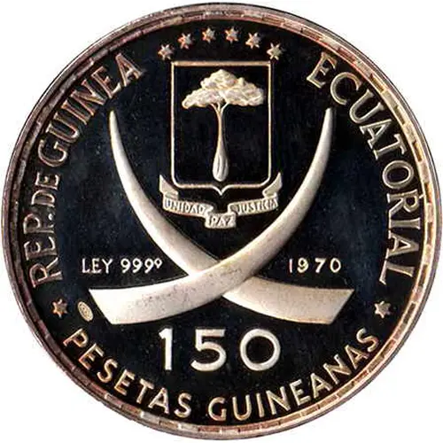 | Averslegende | REP.DE GUINEA ECUATORIAL LEY 9999 1970 150 PESETAS GUINEANAS (Translation: Republic of Equatorial Guinea .9999 Purity 150 Guinean Pesetas) |