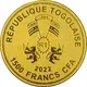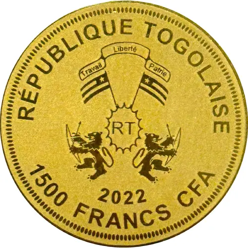 | 表面の銘文 | RÉPUBLIQUE TOGOLAISE Travail Liberté Patrie RT 2022 1500 FRANCS CFA (Translation: Togolese Republic Labour Freedom Homeland) |
