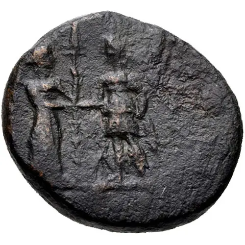 | توضیحات روی سکه | Artemis, holding a long torch, greeting the Amazon Kyme, holding both a scepter |