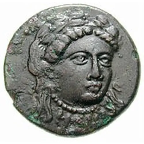 Mô tả mặt trước Three-quarter facing head of Sibyl Herophile, turned slightly right, wearing laurel wreath and pendanted necklace