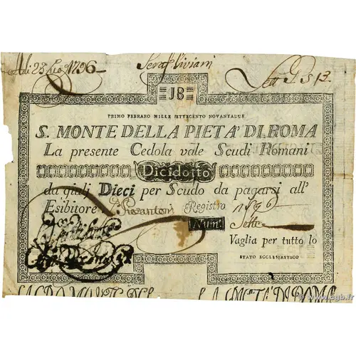 | Opschrift voorzijde | PRIMO FEBRARO MILLE SETTECENTO NOVANTADUE S. MONTE DELLA PIETA` DI ROMA La presente Cedola vale Dicidotto Scudi Romani da giuli Dieci per Scudo da pagarsi all` Esibitore Vaglia per tutto lo STATO ECCLESIASTICO |