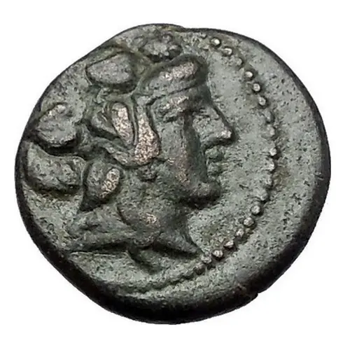 توضیحات روی سکه Ivy wreathed head of Dionysus, right