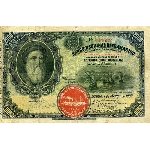 BANCO NACIONAL ULTRAMARINO O THESOUREIRO DA FILIALA EM LOURENÇO MARQUES PAGARÁ Á VISTA AO PORTADOR DOIS MIL E QUINHENTOS REIS EM MOEDA CORRENTE VALOR RECEBIDO |
