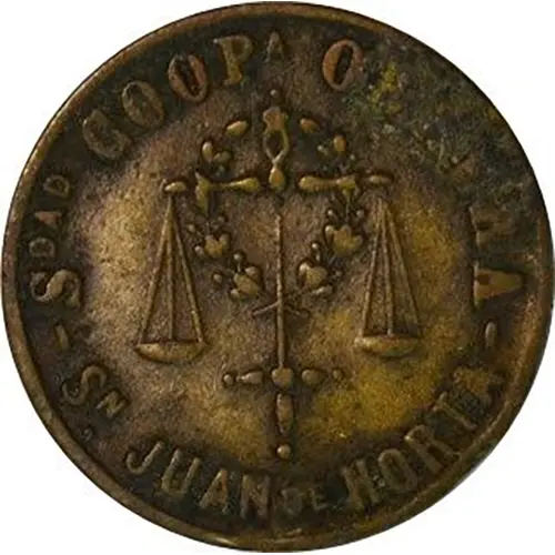 | Legenda do anverso | SDAD COOPA OBRERA - SN JUAN DE HORTA - (Translation: Workers` Cooperative Society) |