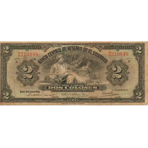 | Obverse lettering | BANCO CENTRAL DE RESERVA DE EL EL SALVADOR PAGARA AL PORTADOR DOS COLONES DE ACUERDO CAON EL ARTICULO 39 DE SU LEY CONSTITUTIVA SAN SALVADOR |