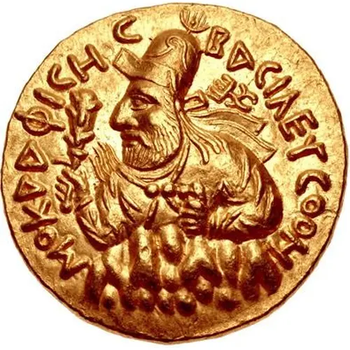 (Translation: maharajasa rajadirajasa sarvaloga isvarasa mahisvarasa vima kathpisasa tradara of great king, king of kings, lord of the world, great lord, Vima Kadphises, saviour) |