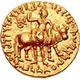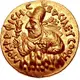 Diademed and crowned half-length bust of Vima Kadphises left on clouds, holding mace-scepter in right hand over shoulder; flames at shoulder, tamgha to right |