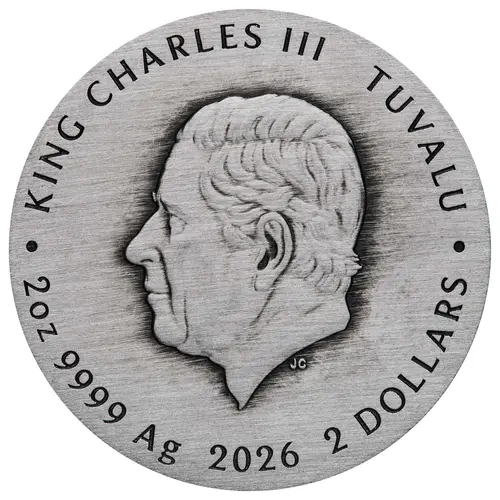 Obverse lettering · KING CHARLES III TUVALU · JC 2oz 9999 Ag 2026 2 DOLLARS