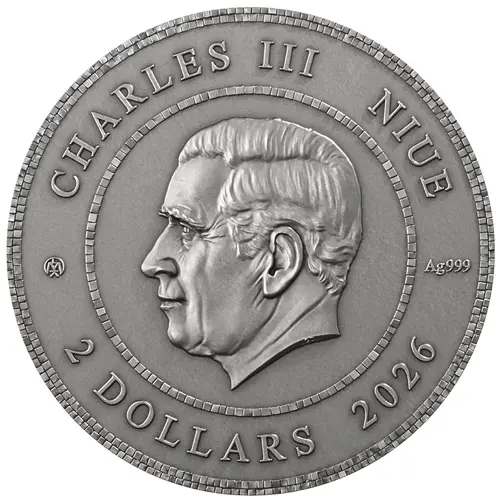 Obverse lettering CHARLES III NIUE Ag 999 2 DOLLARS 2026