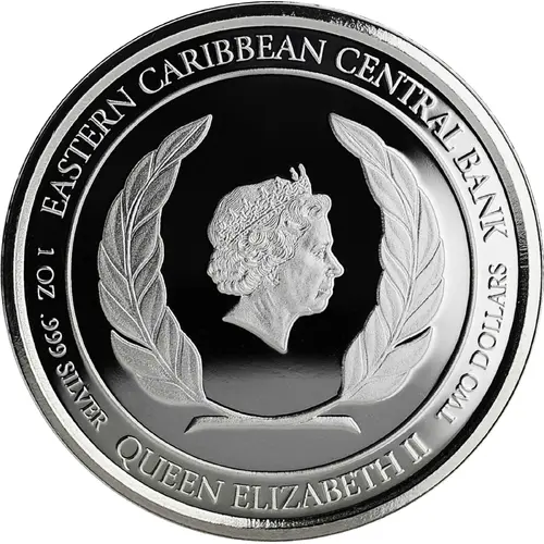 | Legenda do anverso | EASTERN CARIBBEAN CENTRAL BANK 1 OZ .999 SILVER TWO DOLLARS QUEEN ELIZABETH II |