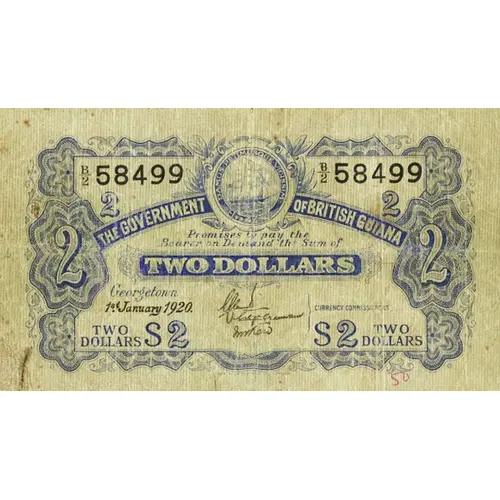 | Opis líce | `DAMUS PETIMUSQUE VICISSIM` THE GOVERNMENT OF BRITISH GUIANA Promisse to pay yhe Bearer on Demand the Sum of TWO DOLLARS Georgetown Currency Comissioners 1st. January, 1920 TWO DOLLARS $2 $2 TWO DOLLARS THOMAS DE LA RUE & COMPANY LIMITED (Translation: Sentence in latin: `WE WILL GIVE AND WE WILL WIN`) |