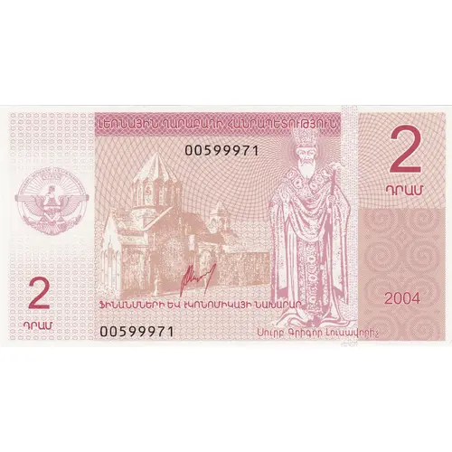 | توضیحات روی اسکناس | National Coat of Arms of Nagorno-Karabakh, Gandzasar Cathedral of Saint of John the Baptist in Madakert district, and Saint Gregory the Illuminator |