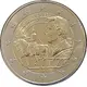 | Mô tả mặt sau | A geographical map of Western Europe spans the outer ring and inner core on the right side of the coin. The inscription 2 EURO is superimposed over the map of Europe, with the numeral “2” located in an open field representing the eastern Atlantic Ocean. 12 stars are located on the right side of the outer ring, with six stars atop the map of Europe and six stars below it; six vertical stripes cut across the inner core of the coin, visually connecting the upper and lower star segments. |