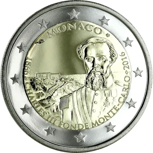 | Obverse description | The design shows CHARLES III within the background MONTE CARLO. At the top is the name of the issuing country ‘MONACO’ flanked by the mint mark and the mint master mark. At the bottom, in semi-circle from left to right is the inscription ‘1866 CHARLES III FONDE MONTE CARLO 2016’. The coin’s outer ring bears the 12 stars of the European Union. |