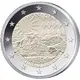 A geographical map of Western Europe spans the outer ring and inner core on the right side of the coin. The inscription 2 EURO is superimposed over the map of Europe, with the numeral “2” located in an open field representing the eastern Atlantic Ocean. 12 stars are located on the right side of the outer ring, with six stars atop the map of Europe and six stars below it; six vertical stripes cut across the inner core of the coin, visually connecting the upper and lower star segments. |
